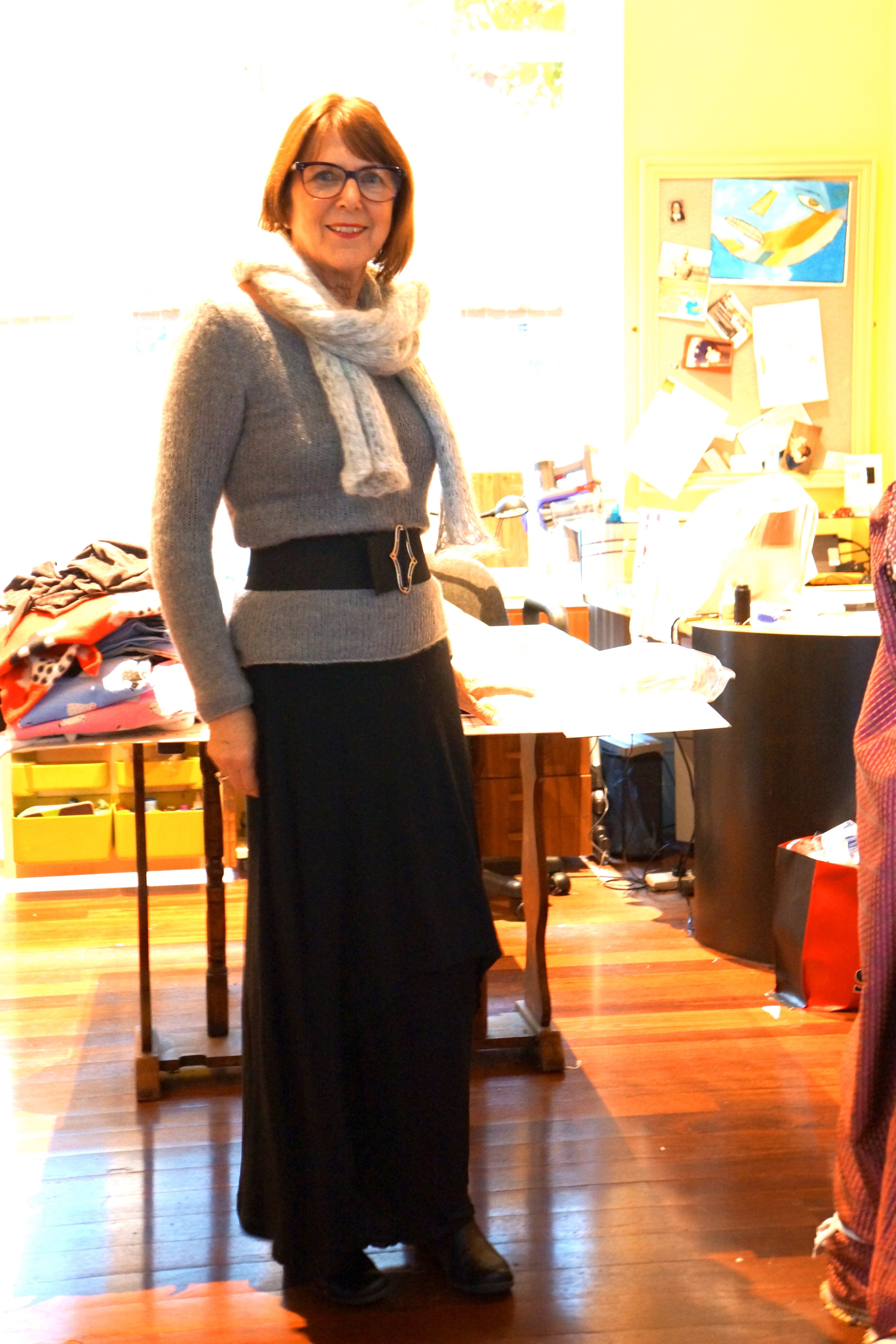 My me-mades today are the same jumper as yesterday – Filatura di Crosa’s Romantic Blouse, modified massively – I made it the correct length, but left all the trims off. I also blended the Superior yarn with some cashmere bought from a woollen mill in the UK to make it thicker, so I don’t always have to wear something under it. I am also wearing a scarf made from yarn bought in NZ – it feels like I have a cat wrapped round my neck, and it sheds all over me in a very catlike way as well! I am wearing a belt made from wide elastic with a gorgeous Edwardian silver buckle bought from an antique shop in Sydney, and I have the ubiquitous knitted socks on – not shown here. I am also wearing a non-me made skirt by Sab Five Five (the shame!).